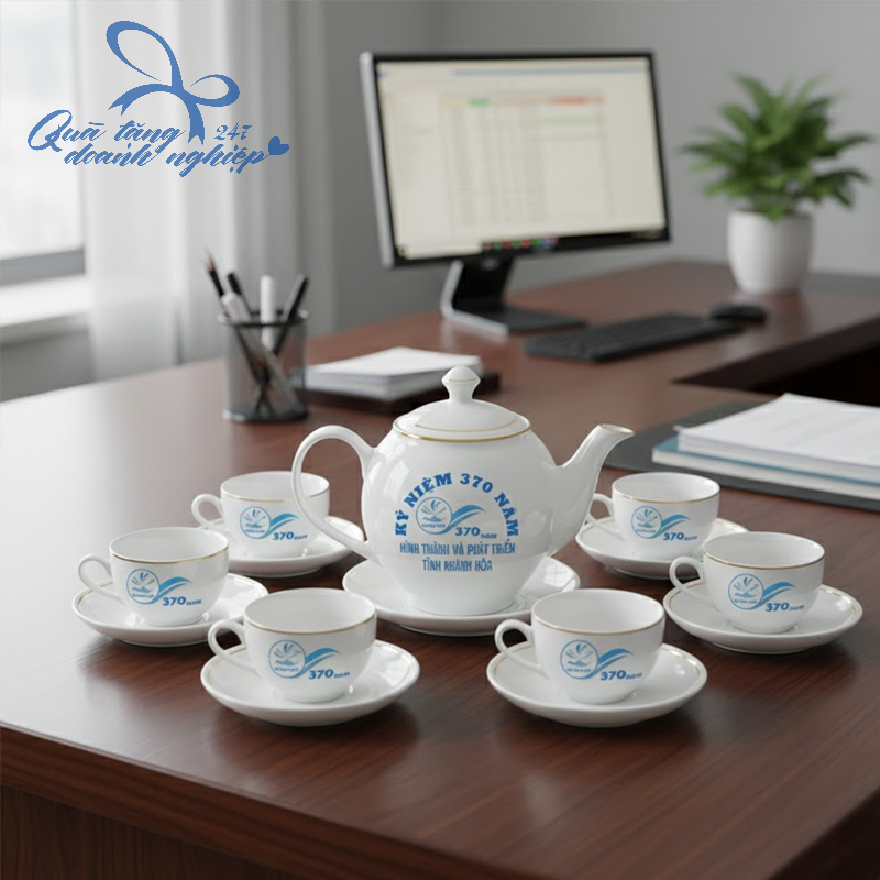 Bộ Ấm Trà Sứ Trắng In Thương Hiệu Theo Yêu Cầu