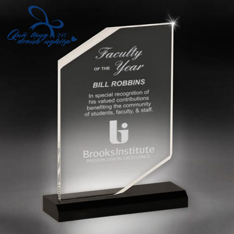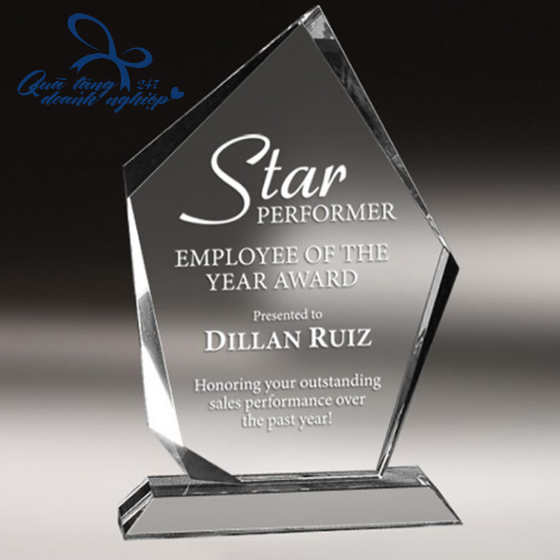Thiết kế trang trọng: hình khối hiện đại, đường cắt tinh xảo, chất liệu pha lê trong suốt hoặc mica cao cấp.
